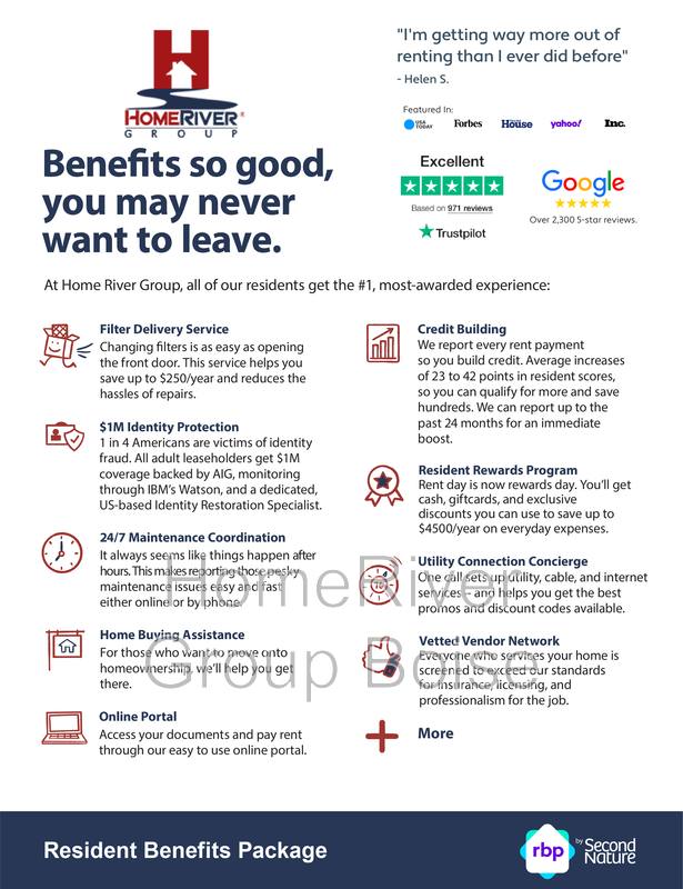 *The estimated total monthly leasing price does not include utilities or optional/conditional fees, such as: pet, utility service, and security deposit waiver fees. Our Resident Benefits Package includes required Renters Insurance, Utility Service Set-Up, Identity Theft Protection, Resident Rewards, HVAC air filter delivery (where applicable), and Credit Building, all at the additional monthly cost shown above. To learn more about additional leasing fees and requirements, please contact HomeRiver Group at 208-261-7070 .